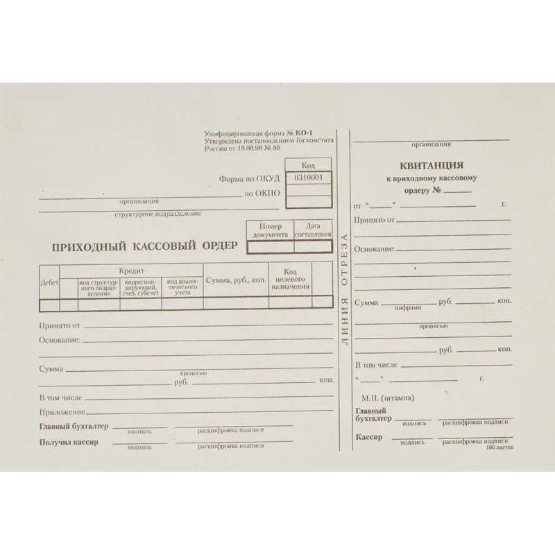 Бланк Приходный кассовый ордер (кн100л.),газетн.бум.20кн/уп