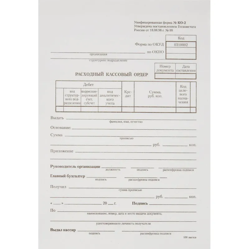 Бланк Расходный кассовый ордер (кн.100л) газетн.бум.20 кн/уп