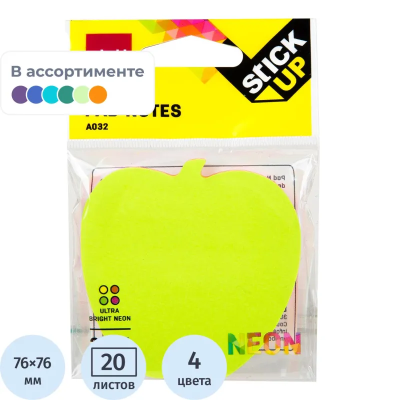 Стикеры с клеевым краем Deli 76х76 мм,20 листов,неон-е,форма в асс-те