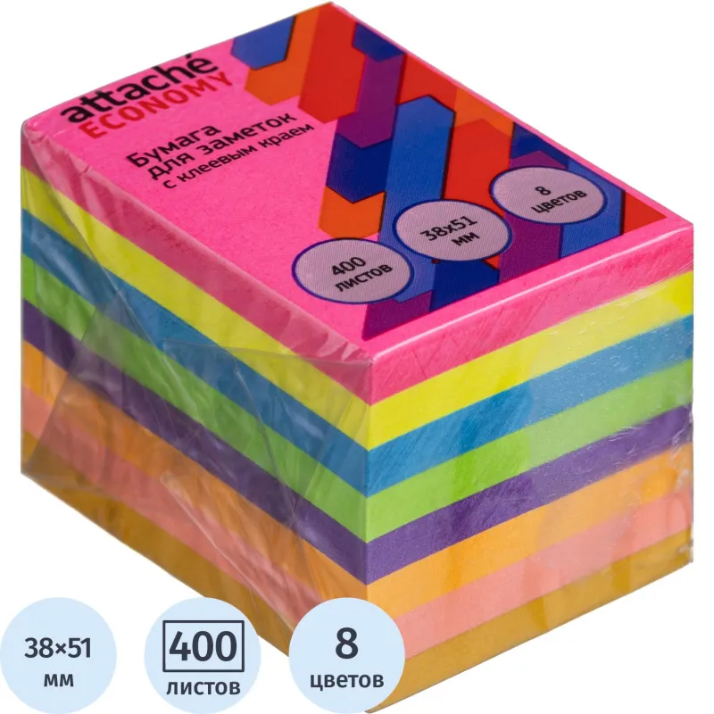 Стикеры Attache Economy с клеев.краем 38x51 мм, 400 лист, 8 неоновых цв