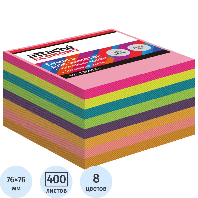 Стикеры Attache Economy с клеев.краем 76х76 мм, 400 лист, 8 неоновых цв