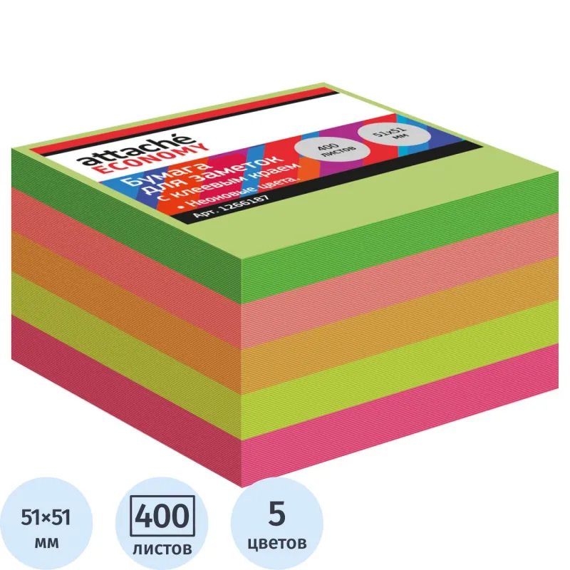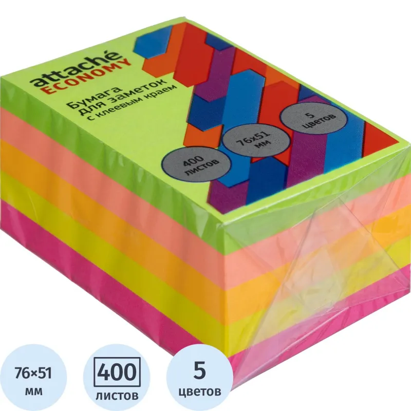 Стикеры Attache Economy с клеев.краем 76х76 мм, 400 лист, 5 неоновых цв