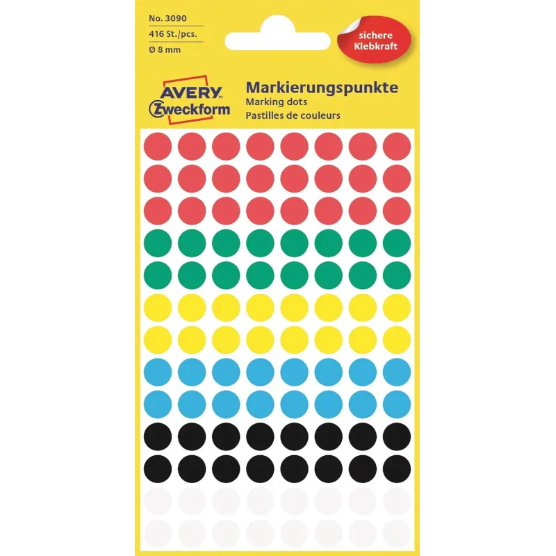 Этикетки самоклеящиеся точки, 3090, d=8mm,разноцветные, 416шт/уп