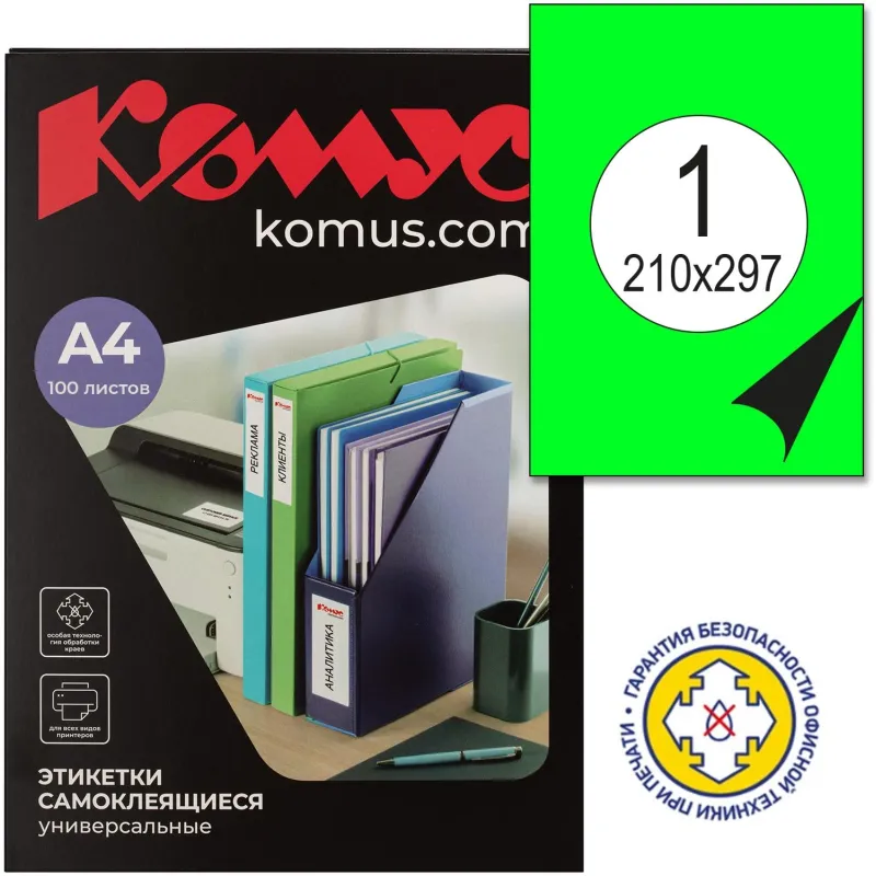 Этикетки самоклеящиеся 210х297мм зеленая 1шт/л А4 50л/уп