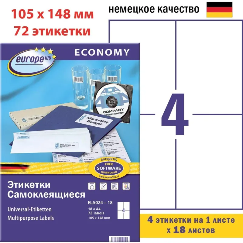 Этикетки самоклеящиеся Europe, 105х74мм на листеА4,18л/уп