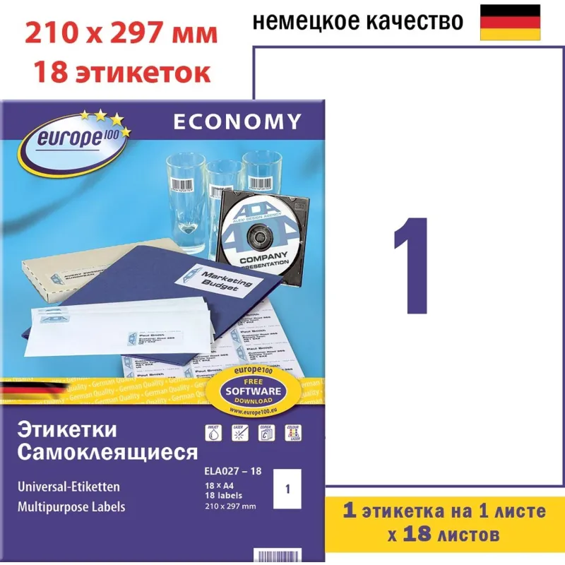 Этикетки самоклеящиеся Europe ELA027-18, 210х297мм, на листеА4 18 л/уп.