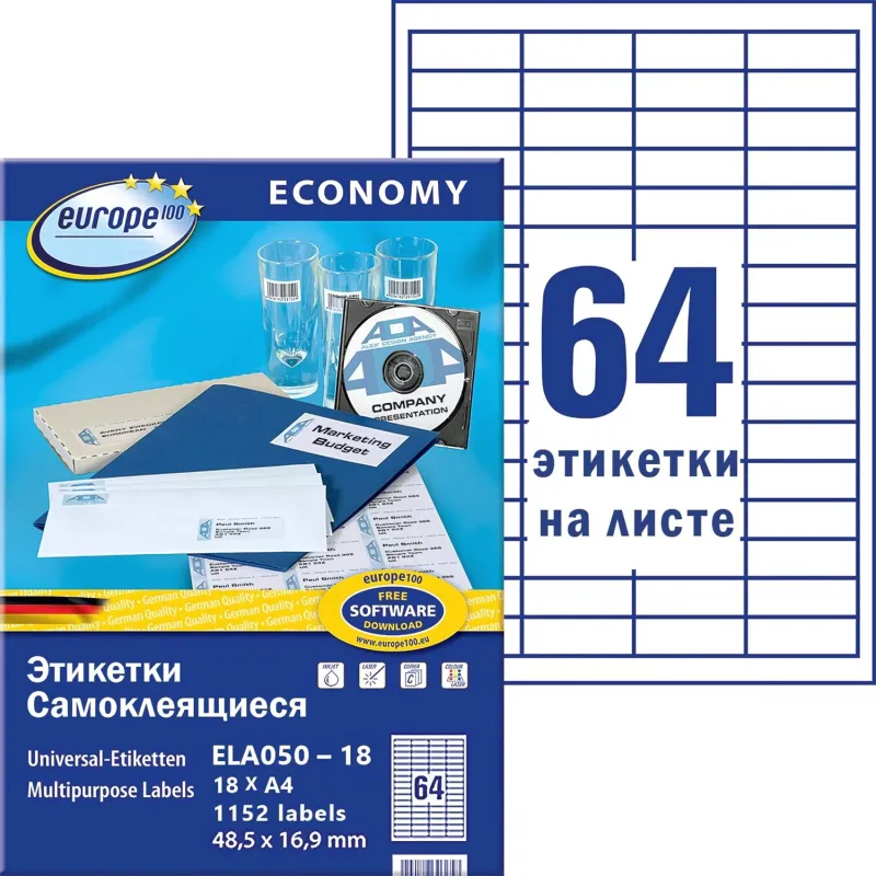 Этикетки самоклеящиеся Europe,48,5х16,9мм на листеА4,18л/уп