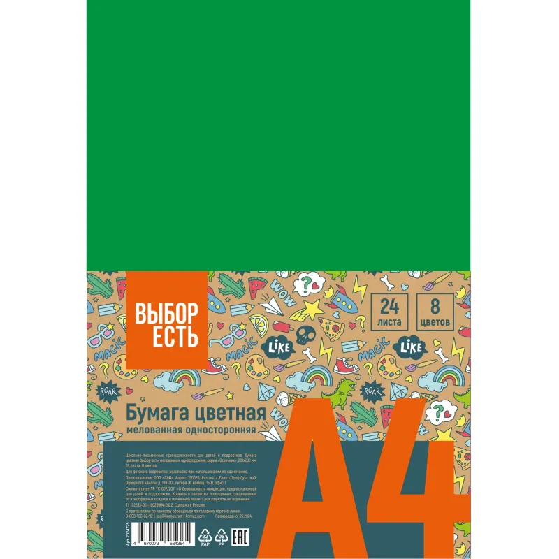 Бумага цветная Выбор Есть Отличник А4 24л 8цв.одностор, мелован, пакет
