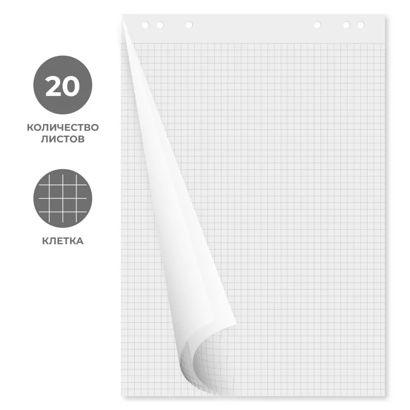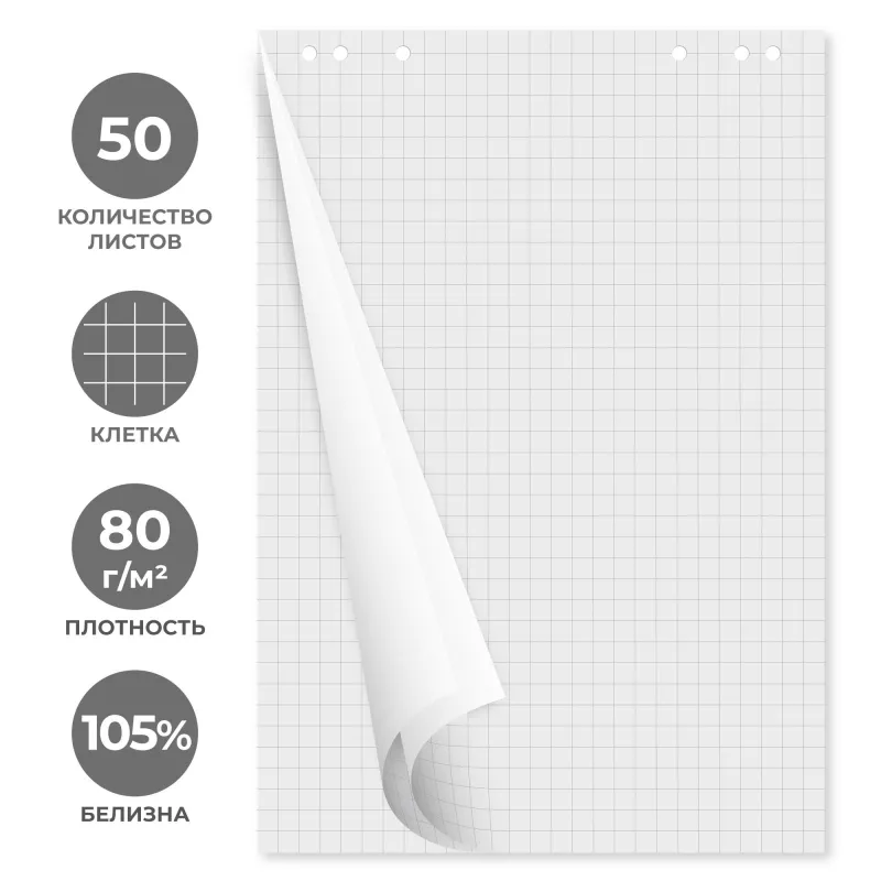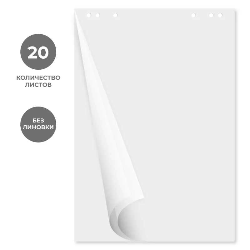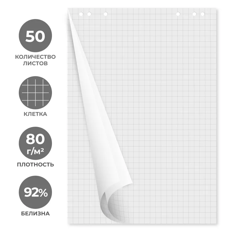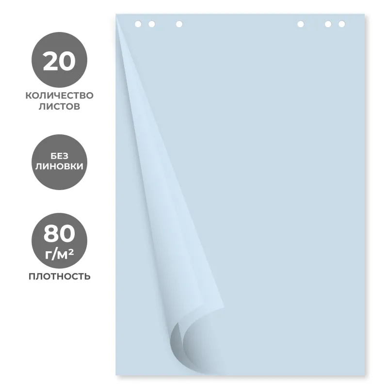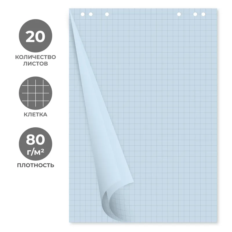 Блокноты для флипчартов изготавливаются из бумаги плотностью преимущественно 70-80 г/м2. Существует варианты с меньшей и большей плотностью. В каждом стандартном блокноте – по 20 склеенных листов, которые могут быть линованными (в клетку) и нелинованными, а также незначительно различаться по длине и ширине. При необходимости можно заказать блок с большим количеством листов – 30,50.