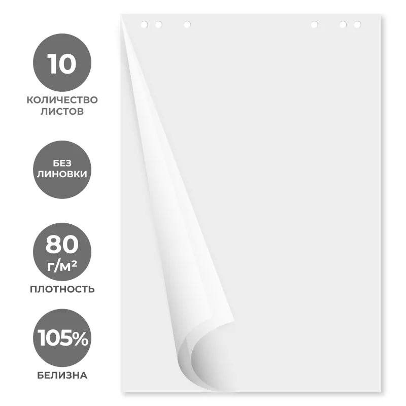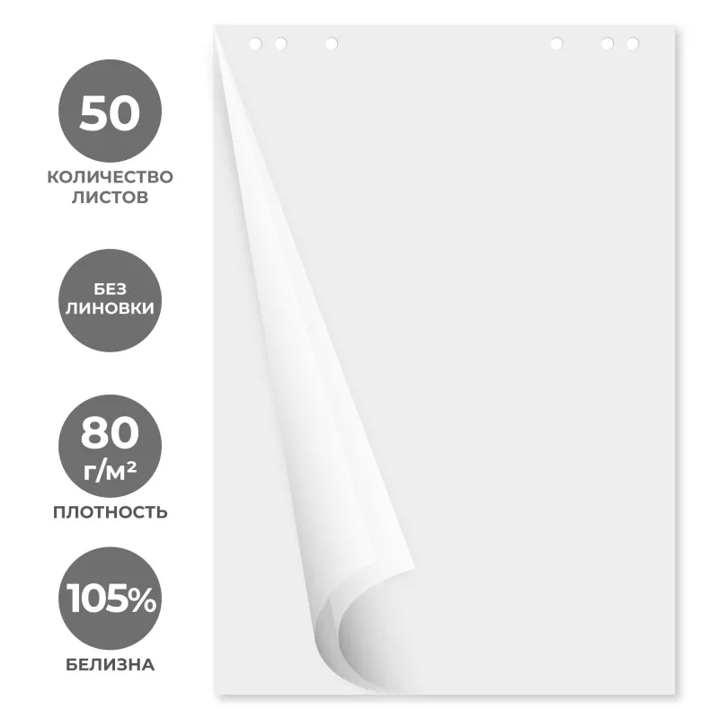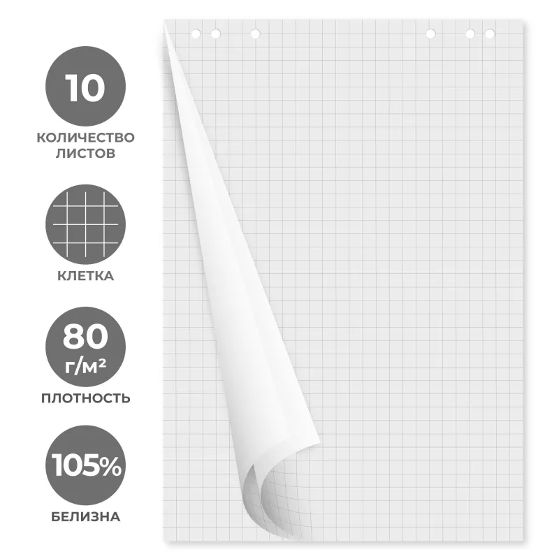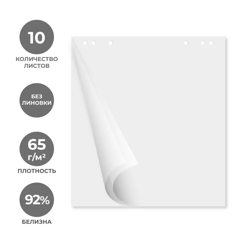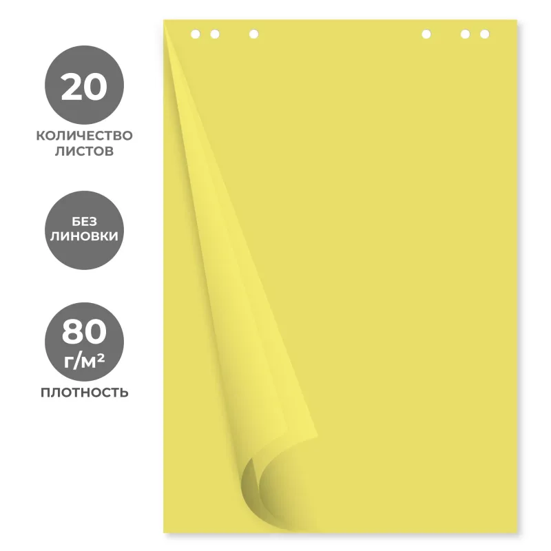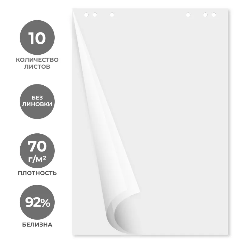 Блокноты для флипчартов изготавливаются из бумаги плотностью преимущественно 70-80 г/м2. Существует варианты с меньшей и большей плотностью. В каждом стандартном блокноте – по 20 склеенных листов, которые могут быть линованными (в клетку) и нелинованными, а также незначительно различаться по длине и ширине. При необходимости можно заказать блок с большим количеством листов – 30,50.