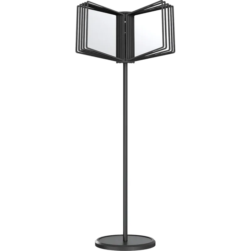 Напольные демонстрационные системы продаются в комплекте с пластиковыми карманами (обычно в количестве 7-10 штук) или без них. Цоколь с прозрачными пластиковыми экранами, обрамленными разноцветным пластиком или металлом, закреплен на штативе с устойчивой подставкой.
