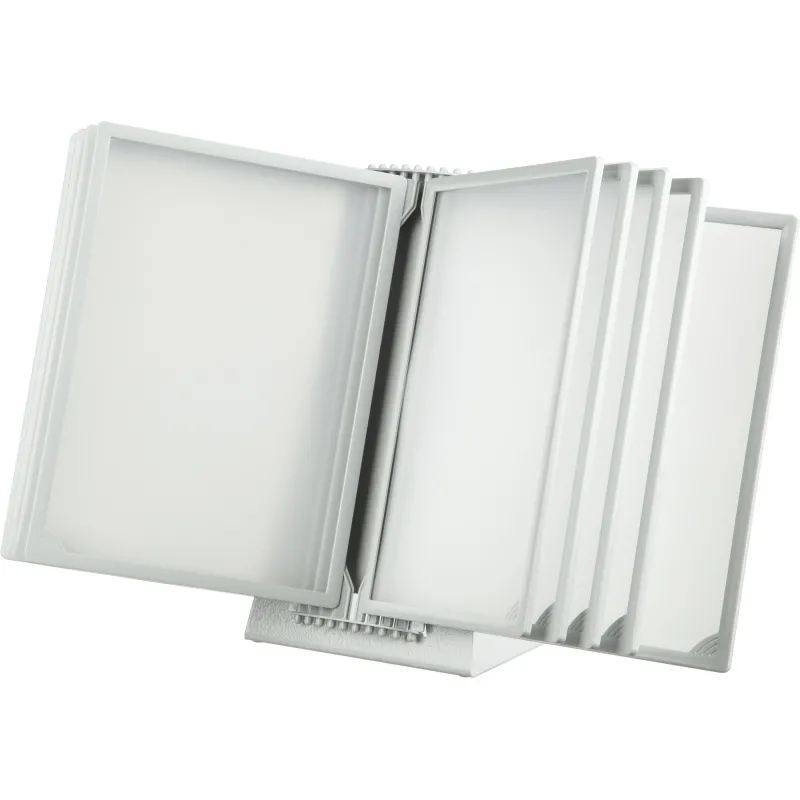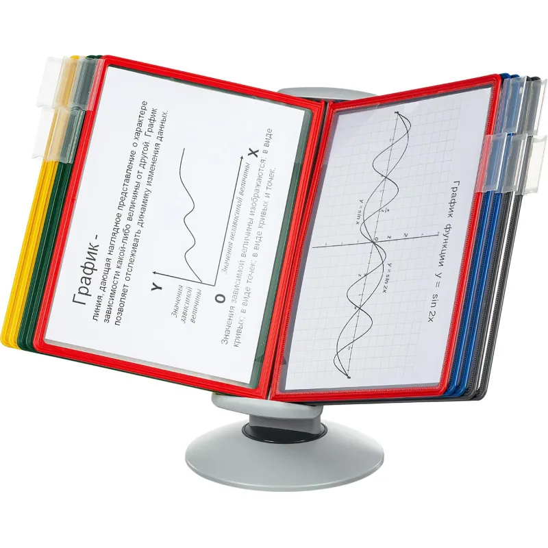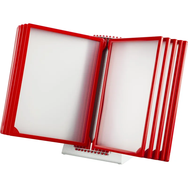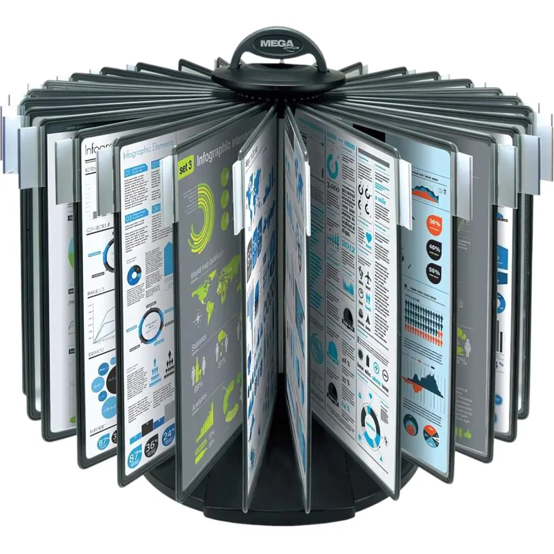 Многообразие моделей отличается дизайном, количеством прозрачных панелей-карманов, форматом, размером подставки и ее конструкторскими особенностями. Существуют круговые, квадратные, прямоугольные подставки, подставки на распорках и пр. Подставки на шарнирах дают потребителю возможность самостоятельно регулировать уровень наклона листов, выбирая максимально комфортную позицию для просмотра тем. В зависимости от типа подставки настольные демонстрационные системы делятся на две группы – книжные и карусельные.
