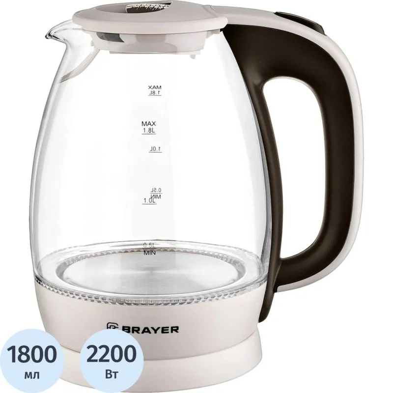 Чайник электрический BRAYER BR1045BN, 2200 Вт, 1,8 л, высококач. Стекло