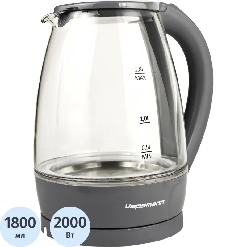 Чайник VEPSMANN VN-193, электрический,1,8 л/2000 Вт,серый