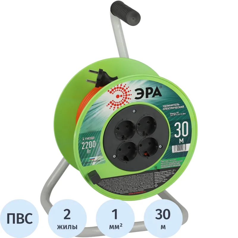 Удлинитель силовой ЭРА ПВС 2х1мм2 30м на пласт.кат. б/з 4 розетки,Б0059782