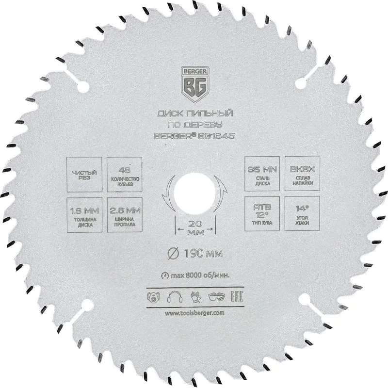 Диск пильный по дереву BERGER, d190x20/16мм, 48зуб, чистый рез (BG1645)