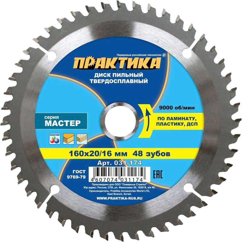 Диск пильный по ламинату ПРАКТИКА, d160х20/16мм (031-174)