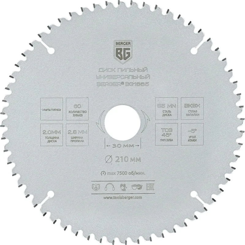 Диск пильный универсальный BERGER мультирез, d210x30мм, 60зуб (BG1665)