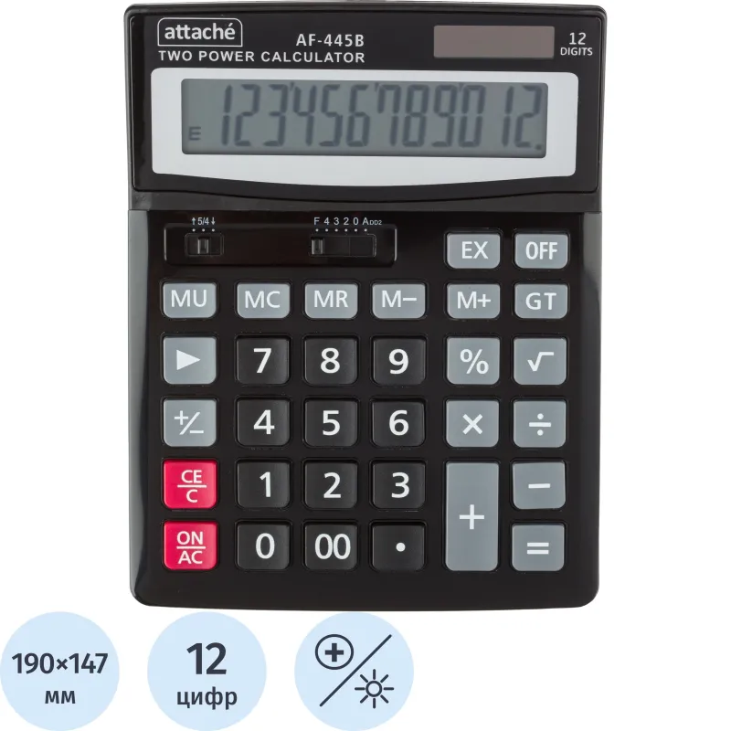 Калькулятор настольный ПОЛНОРАЗМЕРНЫЙ Attache AF-445B,12р,дв.пит,черный
