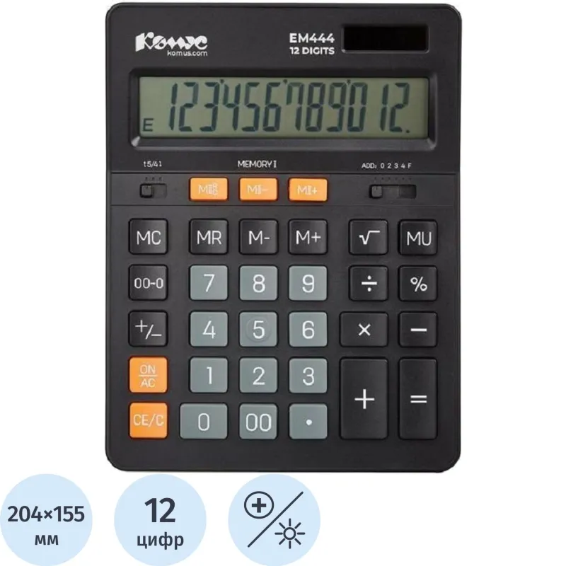 Калькулятор настольный ПОЛНОРАЗМ. КОМУС EM444, 12-р,дв.пит,204x155мм,черн