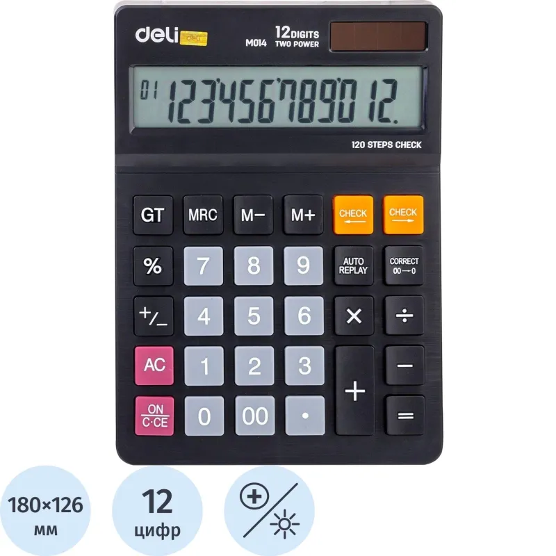 Калькулятор настольный ПОЛНОРАЗМ. Deli EM01420, 12-р,дв.пит, 180х126мм,чер