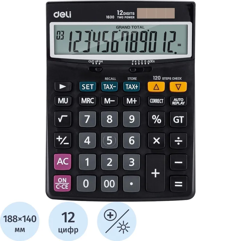 Калькулятор настольный ПОЛНОРАЗМ. Deli E1630, 12-р, дв.пит,188x140мм,черн