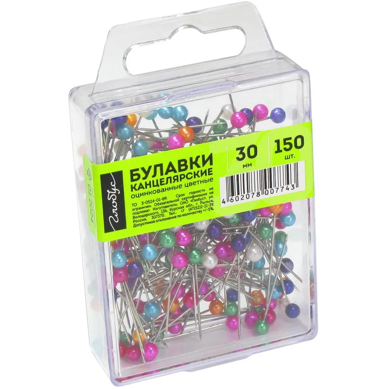 Булавки для пробковых досок Глобус 30 мм 150 шт цвет ассорти, пласт.бокс