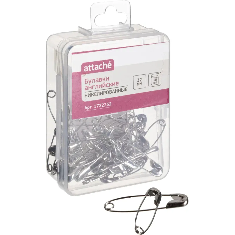 Булавки английские Attache, 32 мм, никелир.,50 шт/уп,пласт.коробка,европодв
