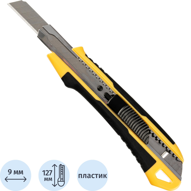 Также конструкцией предусмотрен автофиксатор, с помощью которого вы можете выдвинуть лезвие на необходимую длину и надежно зафиксировать его в выбранном положении. Именно благодаря наличию такого механизма обеспечивается максимальная безопасность того, кто с ним работает.