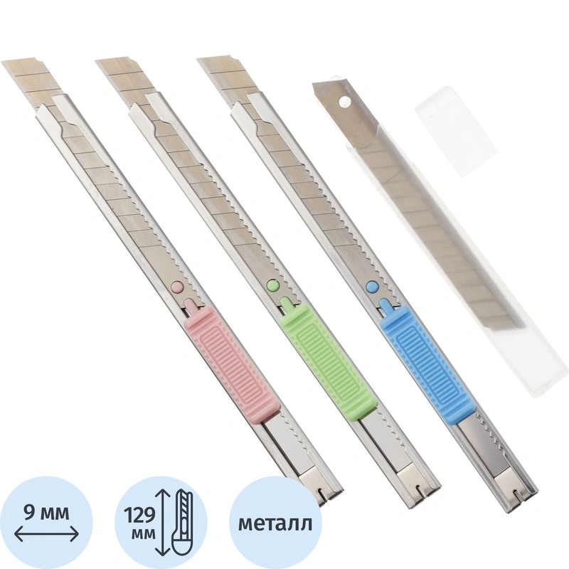 В дорогих моделях ножей канцелярских предусмотрены металлические направляющие, наличие которых обеспечивает изделию долговечность, надежность и безопасность. Благодаря эргономической ручке такие ножи легки и комфортны в работе.