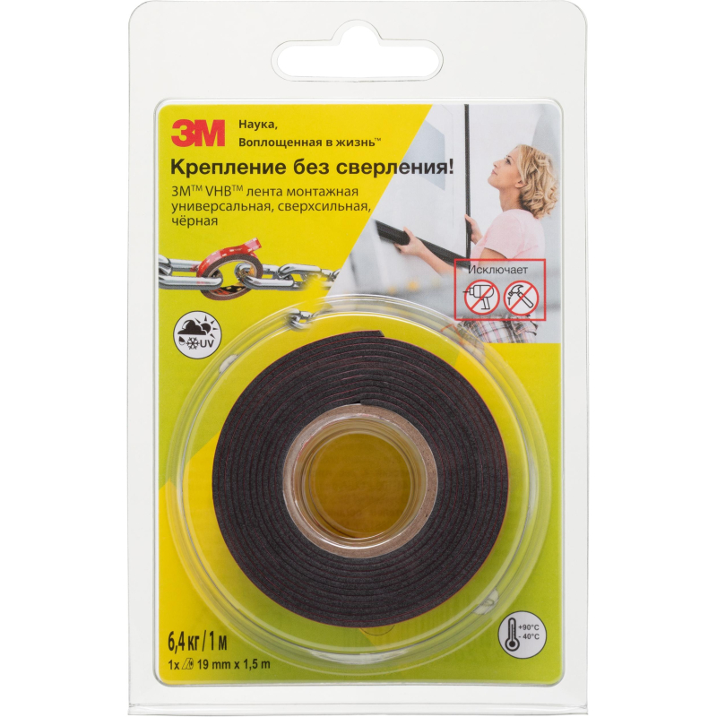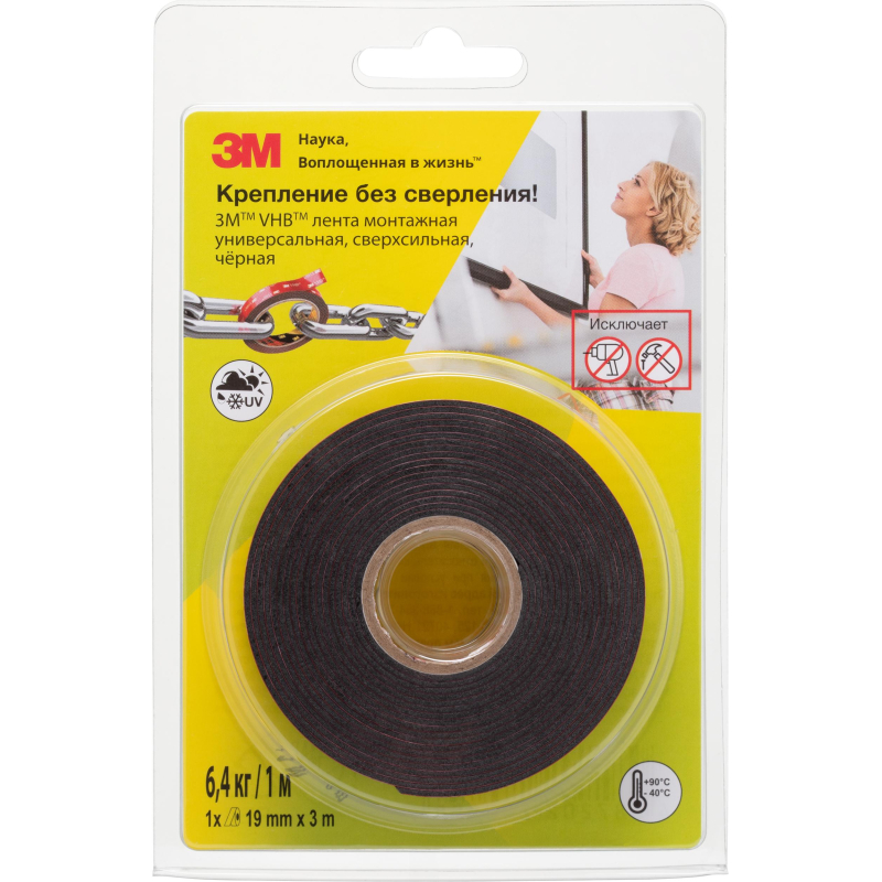 Клейкая лента 3M VHB монтажная универсальная, сверхсильная, черная 19ммх3м