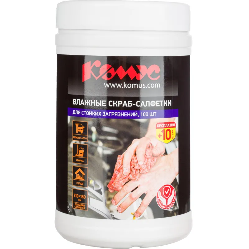 Салфетки влажные КОМУС СКРАБ для очист ки рук от сильн загряз-ний 100+10шт
