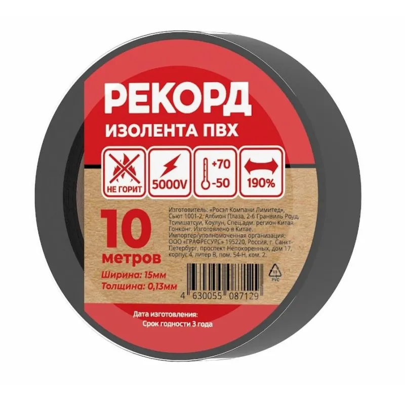 Изолента РЕКОРД 15мм х 10м х 0,13мм, черный (24398)
