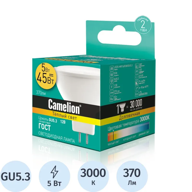 Лампа светодиодная Camelion LED5-MR16/830/GU5.3,5В
