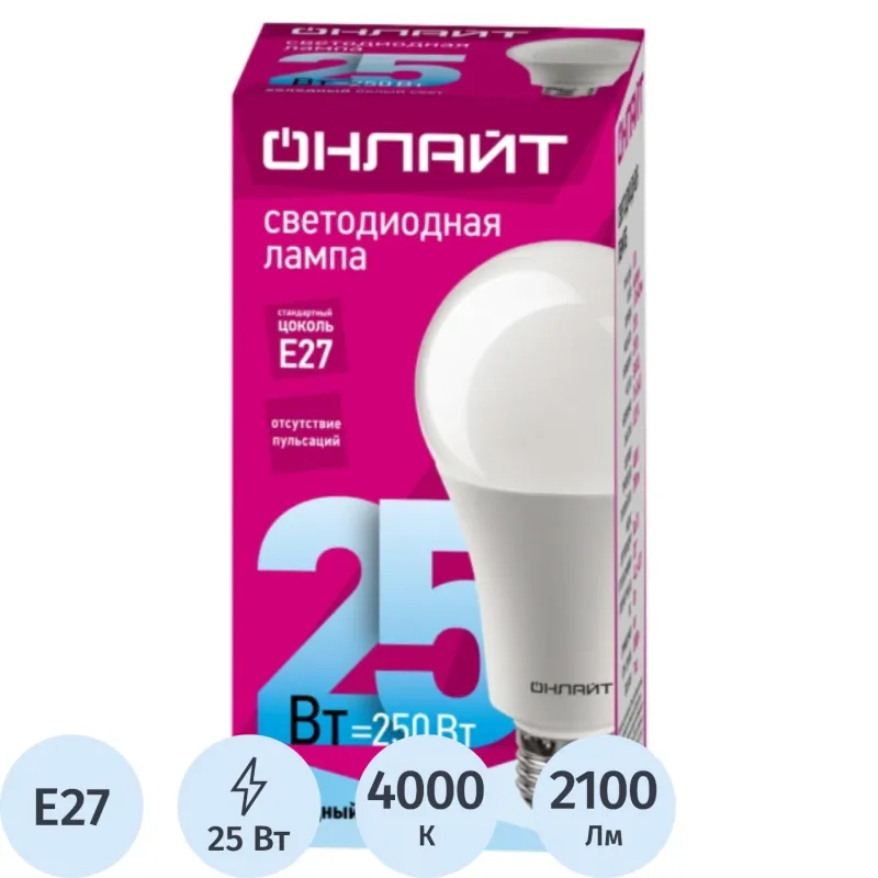 Лампа светодиодная ОНЛАЙТ OLL-A60-25-230-4K-E27 25Вт Е27 4000К 61954