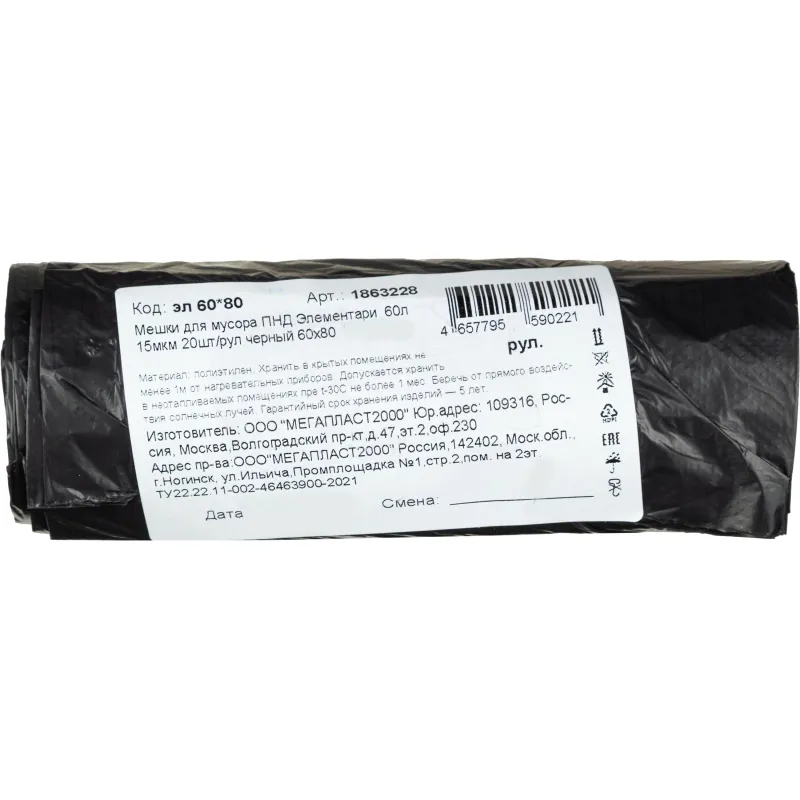 Мешки для мусора ПНД 120л 40мкм 20шт/рул черные 65x105см Элементари