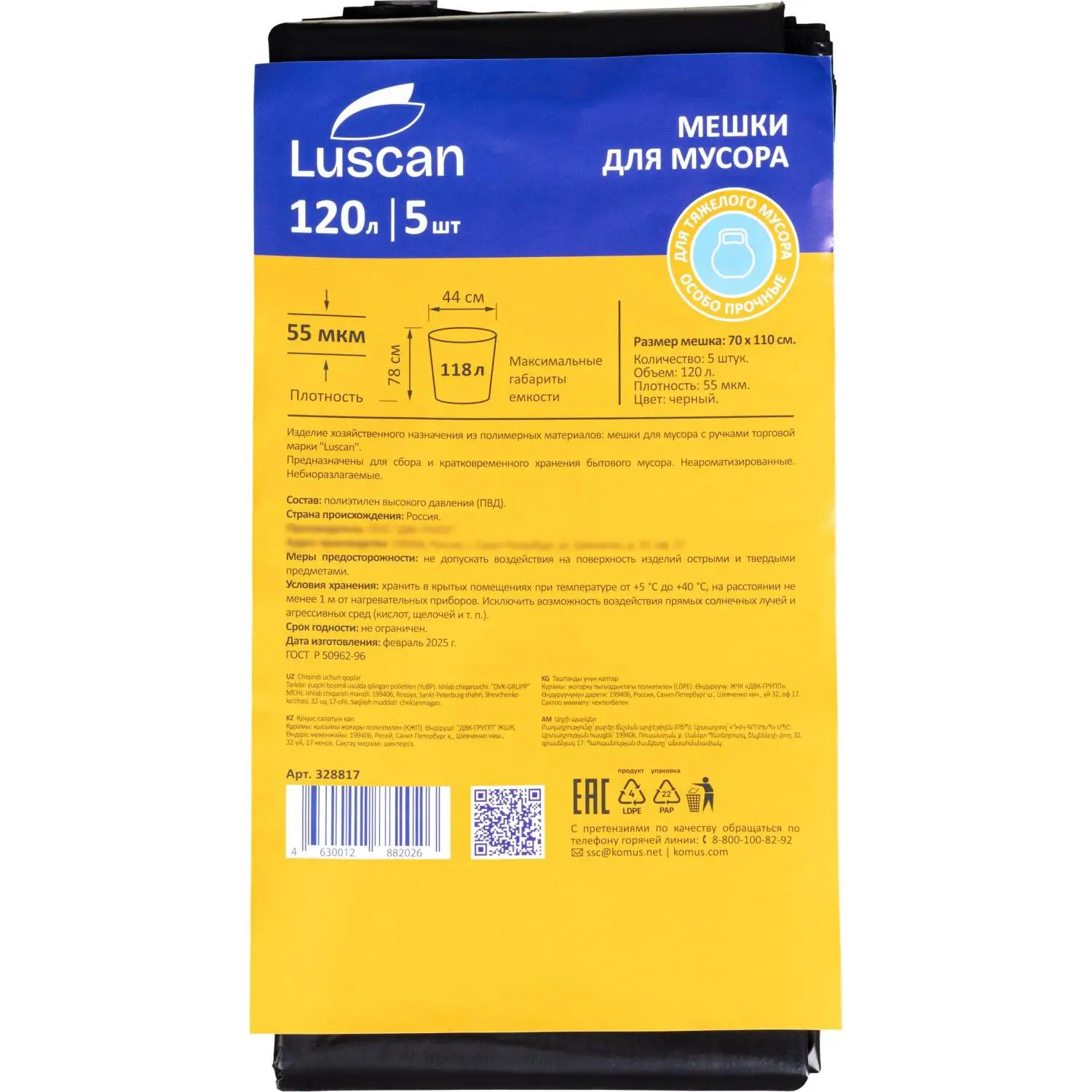 Мешки для мусора ПНД 120л 14мкм 10шт/рул син 70х80см Комус/Luscan Bio с зав