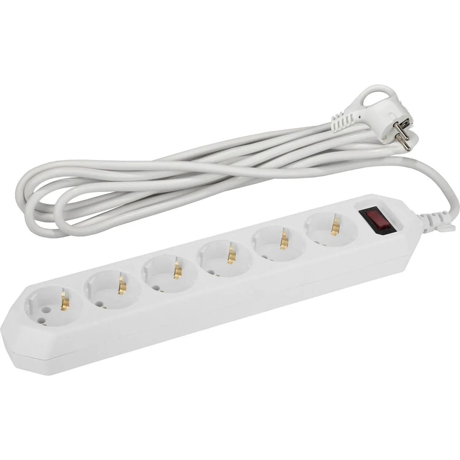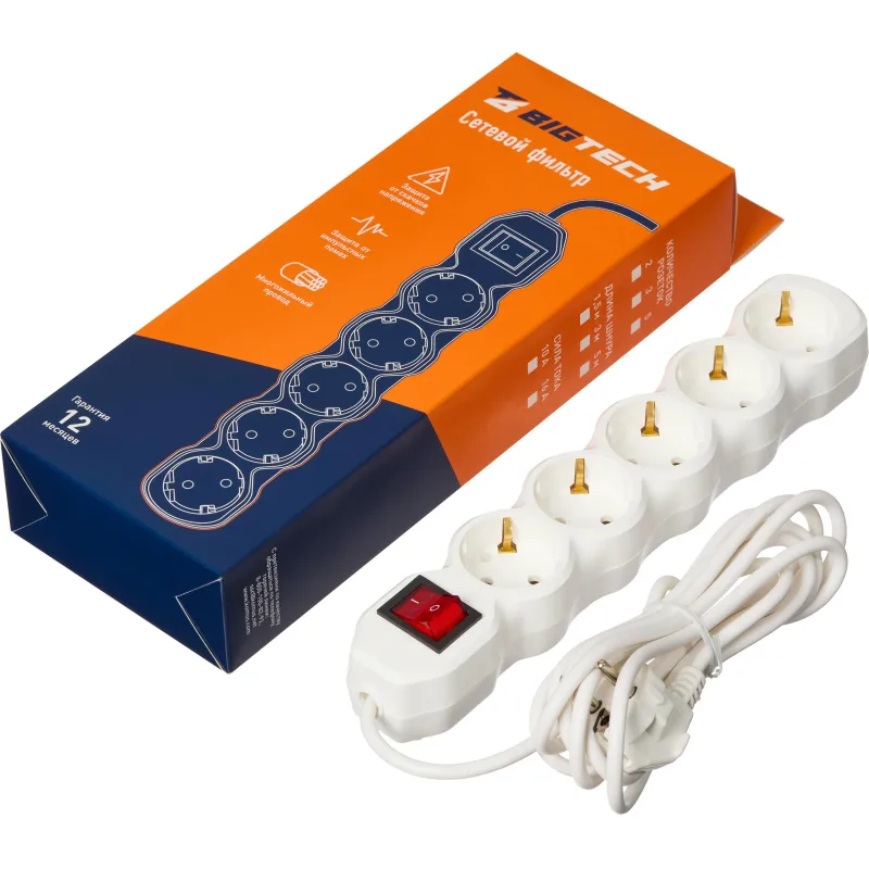 Сетевой фильтр BigTech CD6-5W1 (6р/5м/10А/2500Вт 1мм 2500Вт белый)