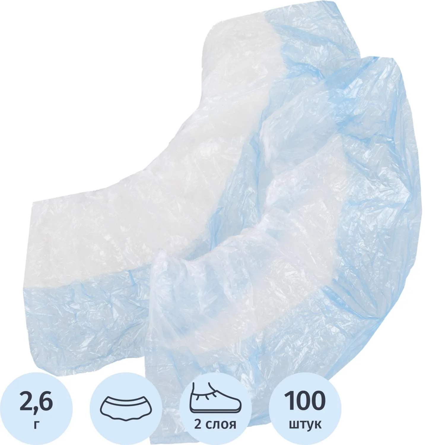 Бахилы 2,6 г, 1рез, 2-ая под, бело-синий, 7+7 мкм, Комус, 50пар/уп