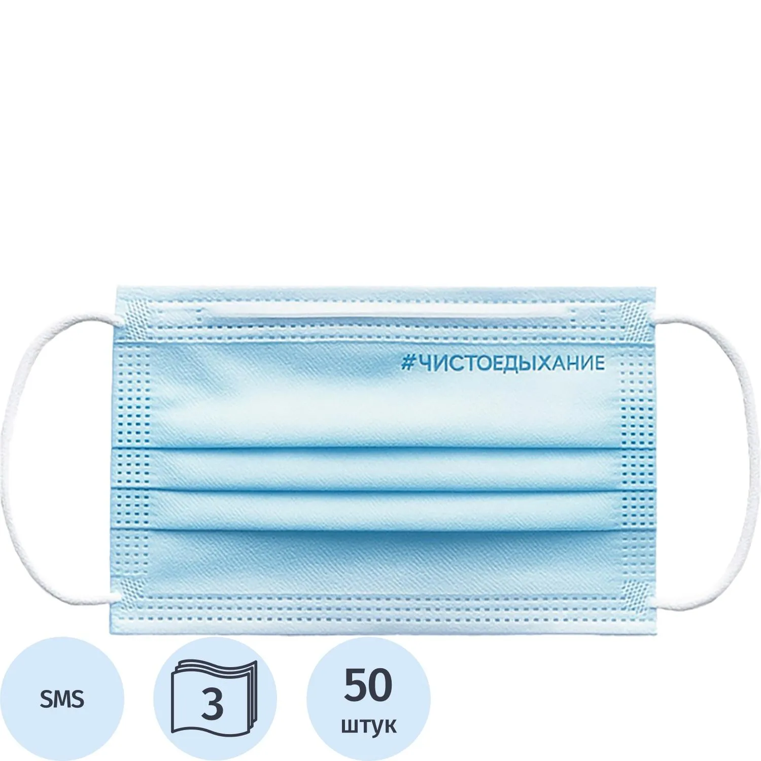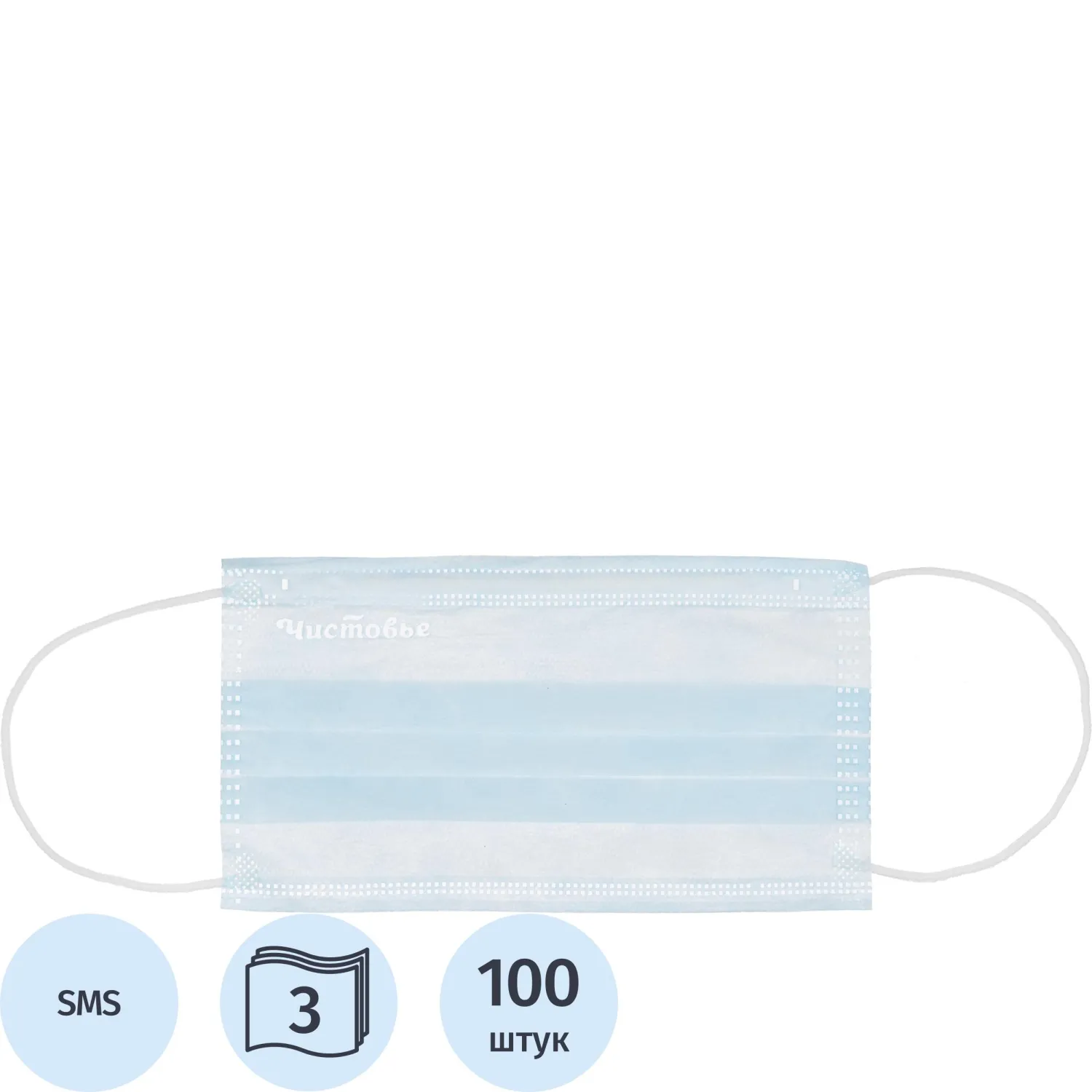 Маска медицинская 3-х сл., резинка, голубая, картон, 100 шт/уп