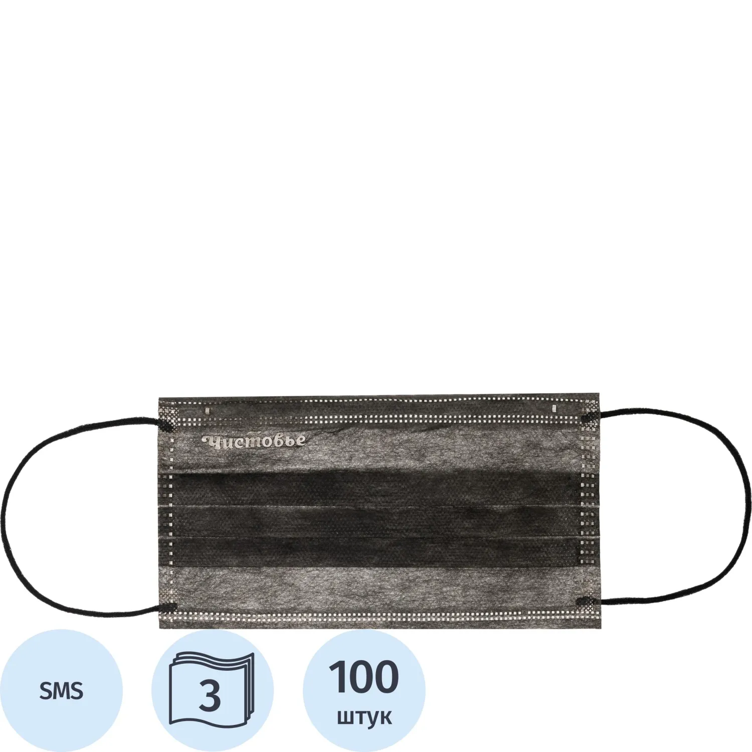 Маска медицинская 3-х сл., резинка, черная, картон 100шт/уп