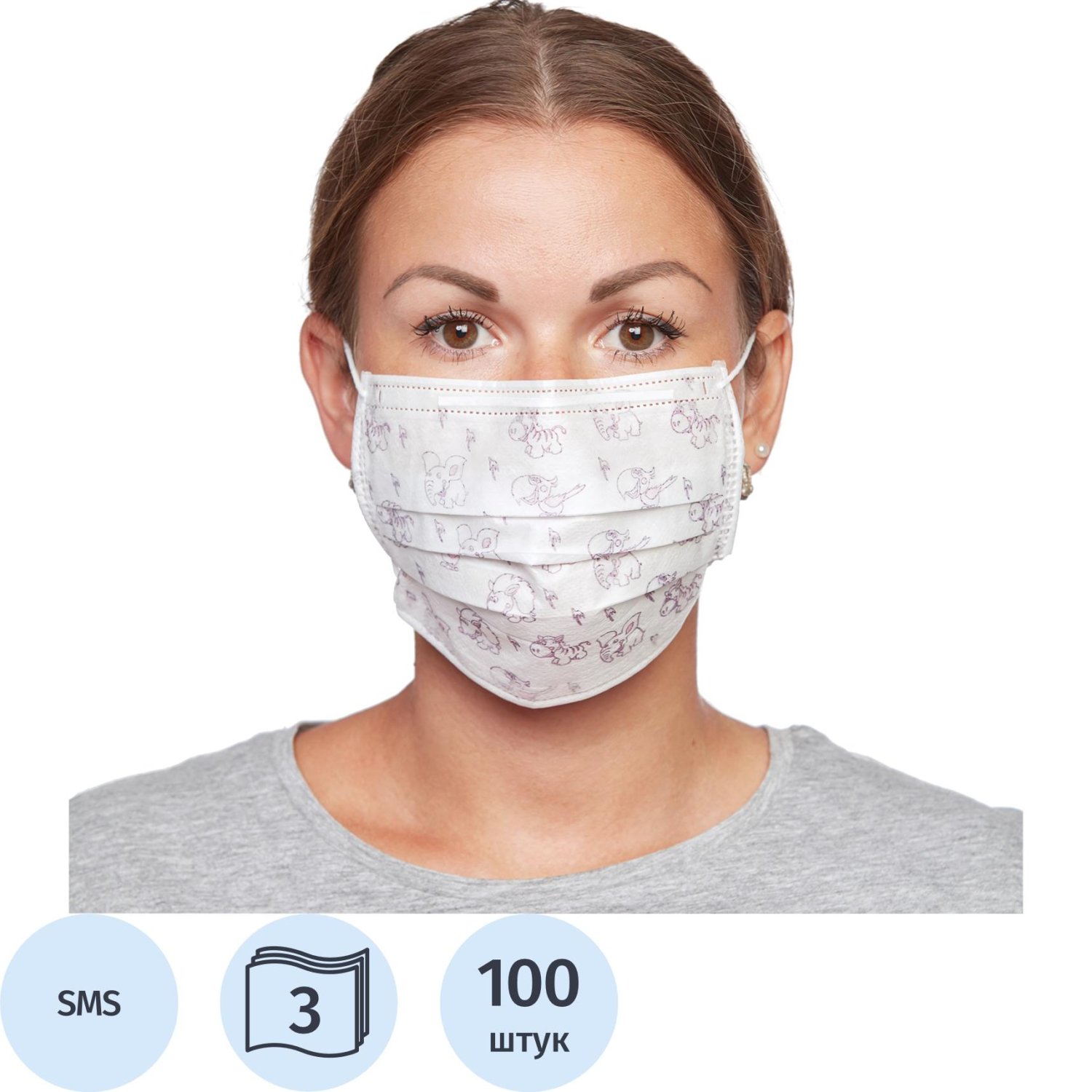 Маска медицинская 3-х сл., резинка,с рисунком 100шт/уп Гекса