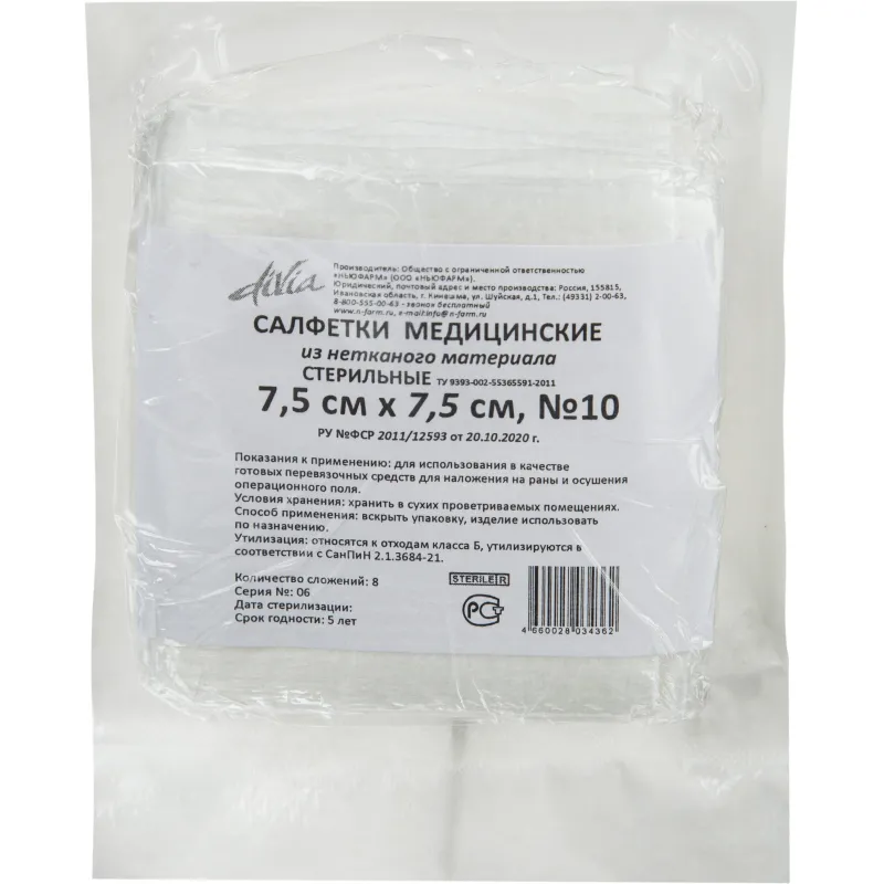 Салфетки нетканые, стер, 7,5х7,5см, №10, пл.40, 8 слож., 10шт/уп ШК34362