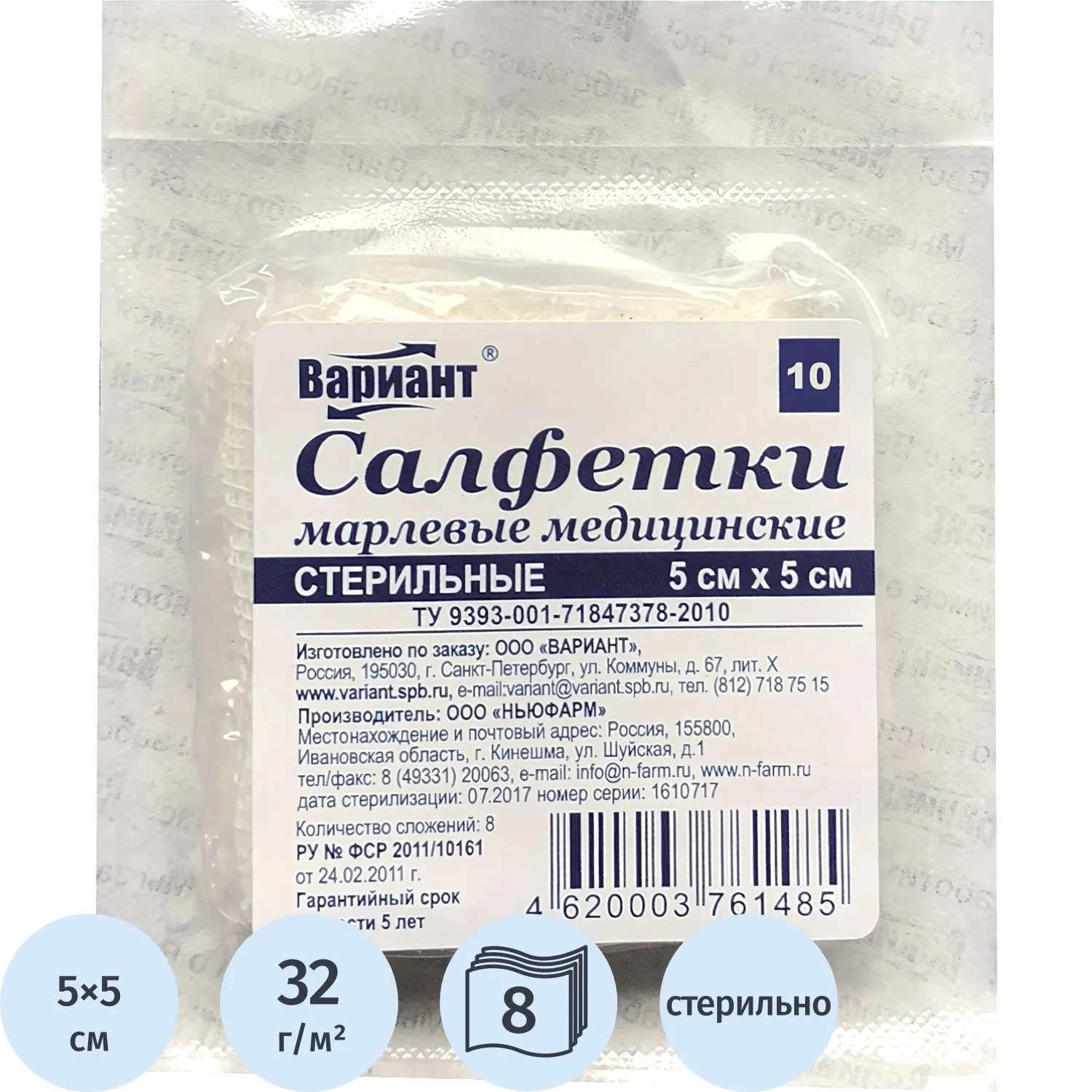 Салфетки стер 5х5см 8сл 17нитей 10шт/уп Вариант ШК61492