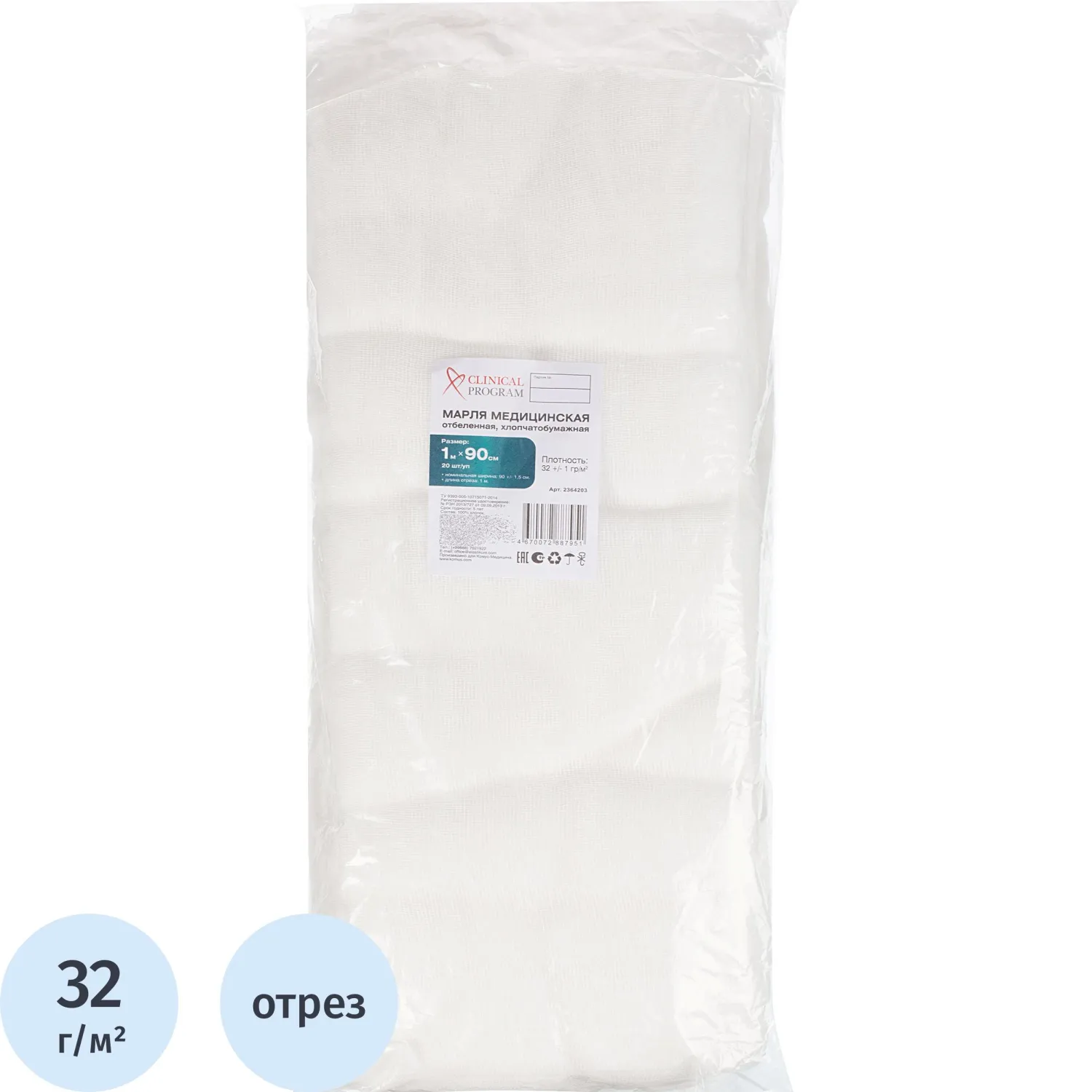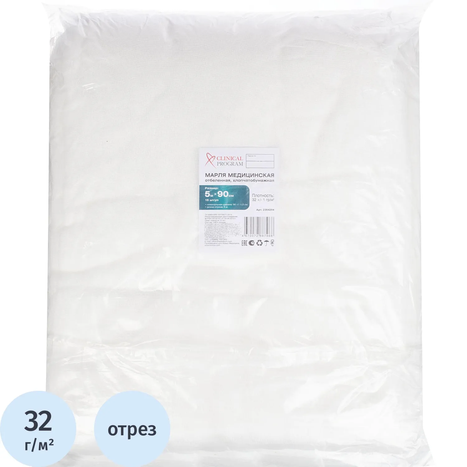Марля медицинская отбеленная 5мx90см, отрез, пл. 32г, 15 шт/уп