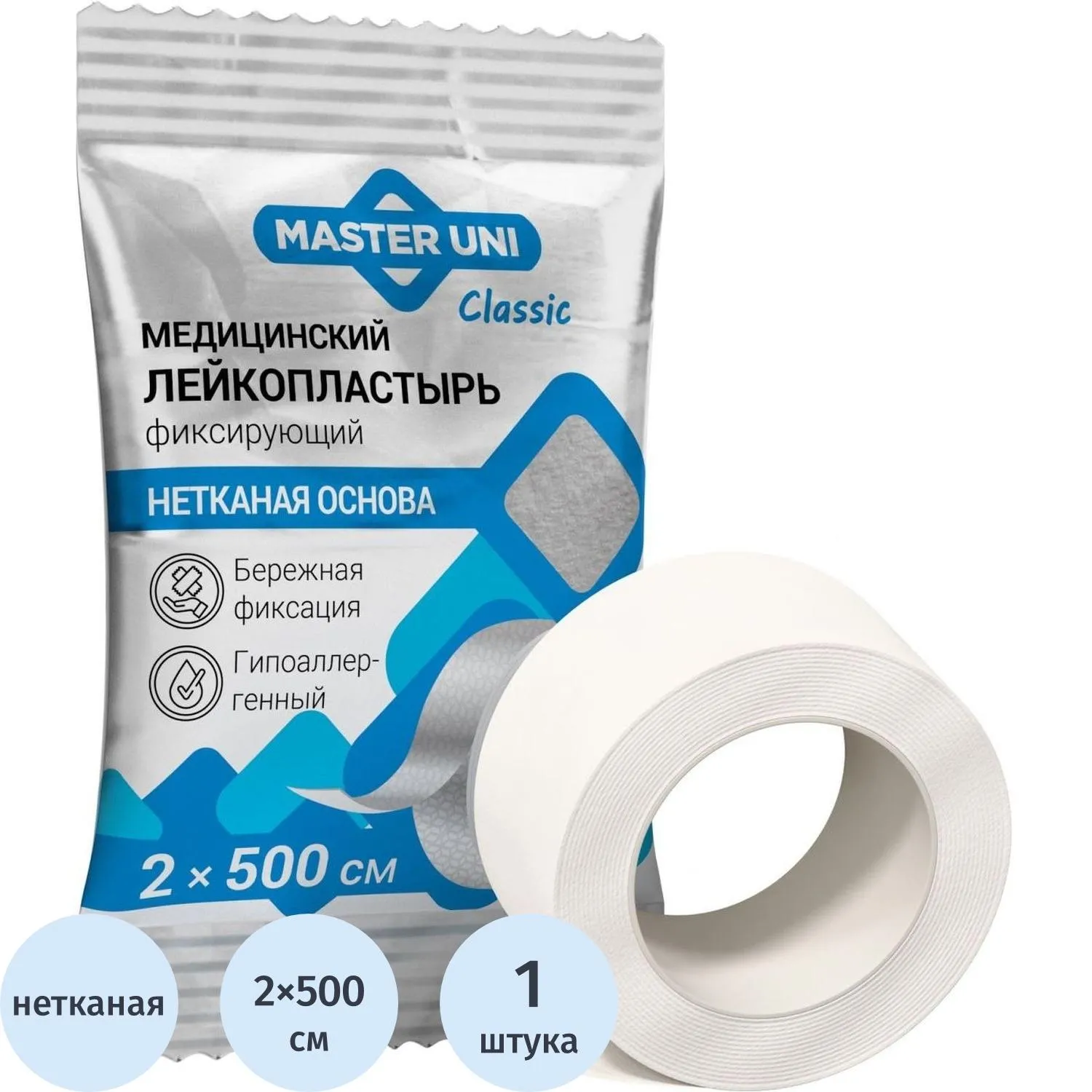 Лейкопластырь 5х500см нетканой в PE пакете, Master Uni, 80 шт/уп