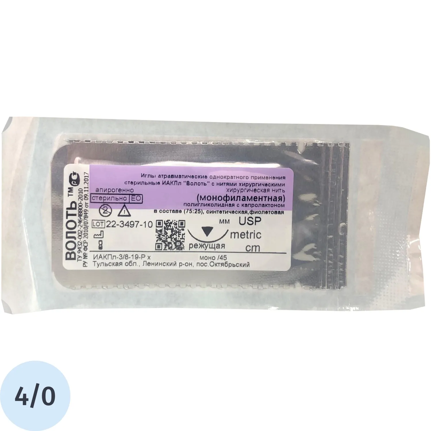 Шовный материал ПГКЛ моно 4/0, 45 см, реж 19 мм, 3/8, 25 шт/уп