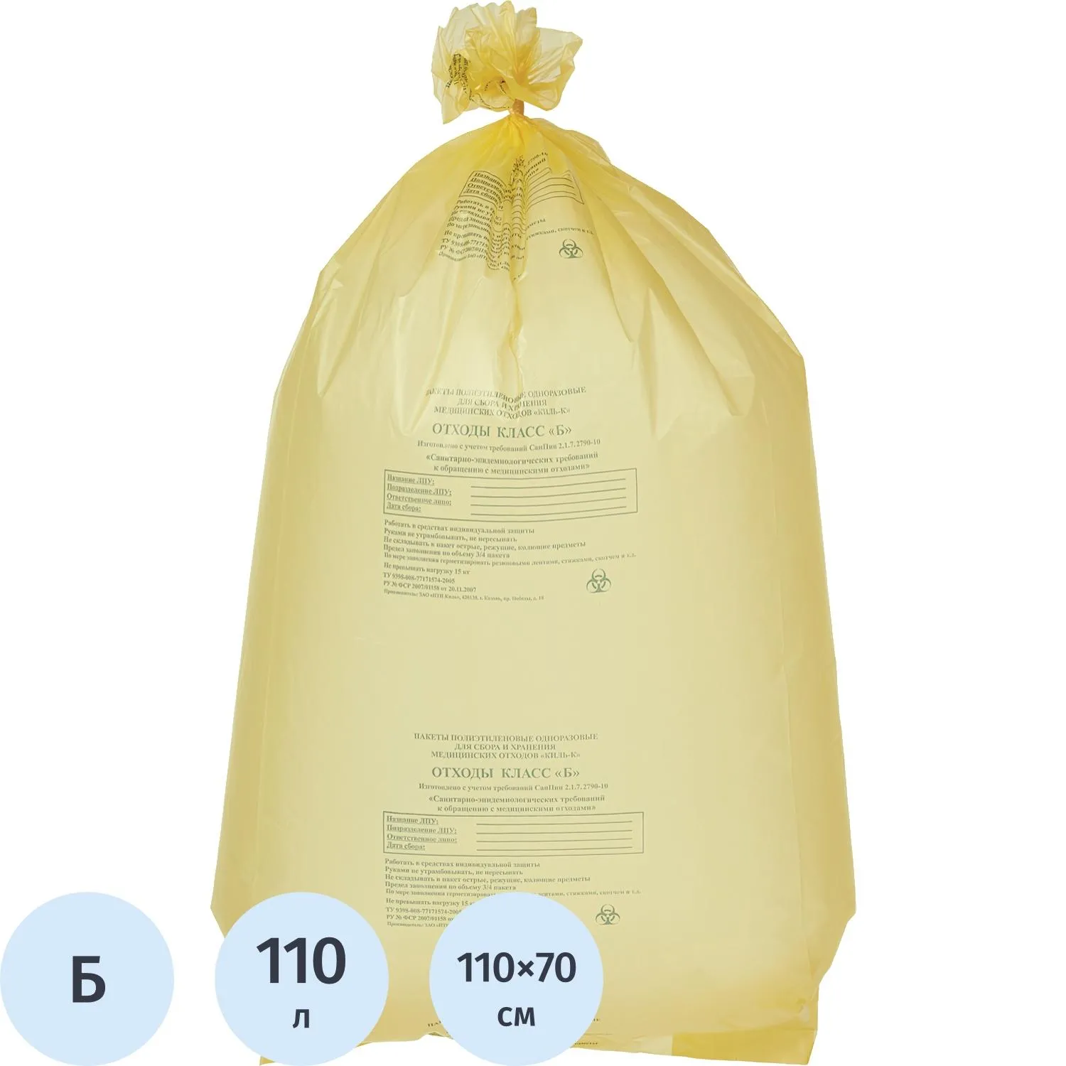 Пакет для мед.отходов кл.Б желтый 700х1100х18мкм, 110л, 100 шт/уп, Респект