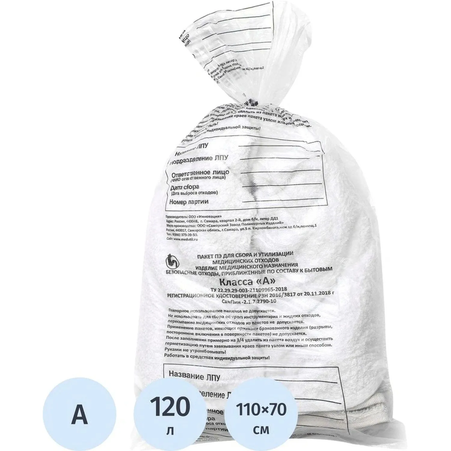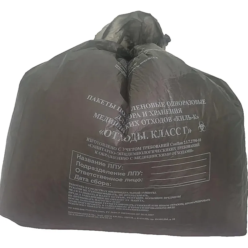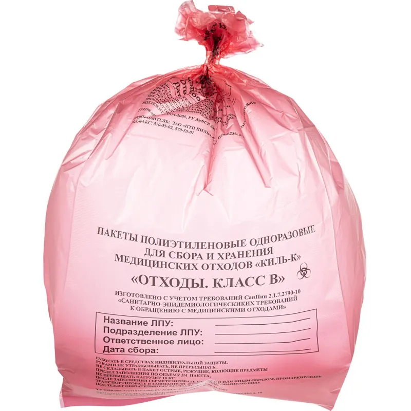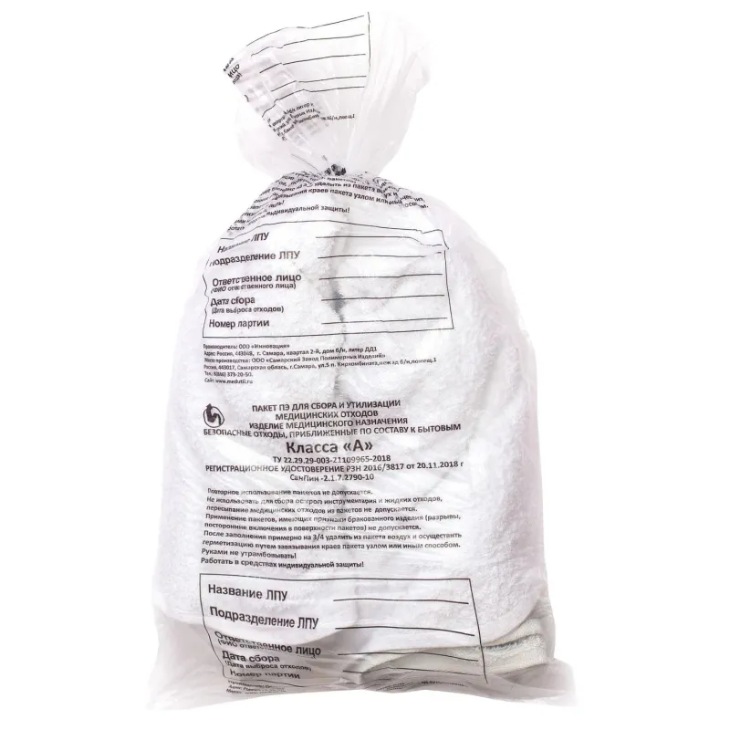 Пакет для мед.отходов кл.А белый 600х1000х18мкм,100л, 100 шт/уп, ПТП Киль