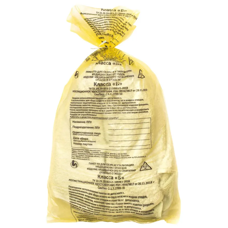 Пакет для мед.отходов кл.Б желтый 600х1000х18мкм, 100л, 100 шт/уп, ПТП Киль